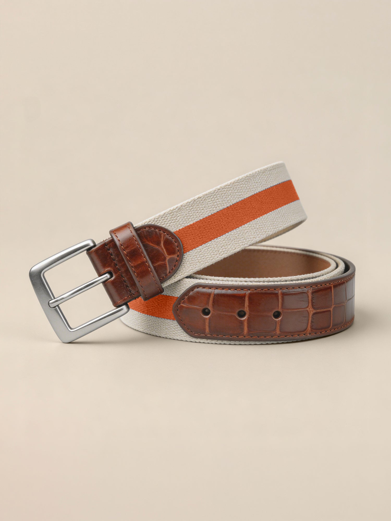 Stretch linen featuring a bold center stripe and accented with crocodile tabs and brushed nickel buckle.