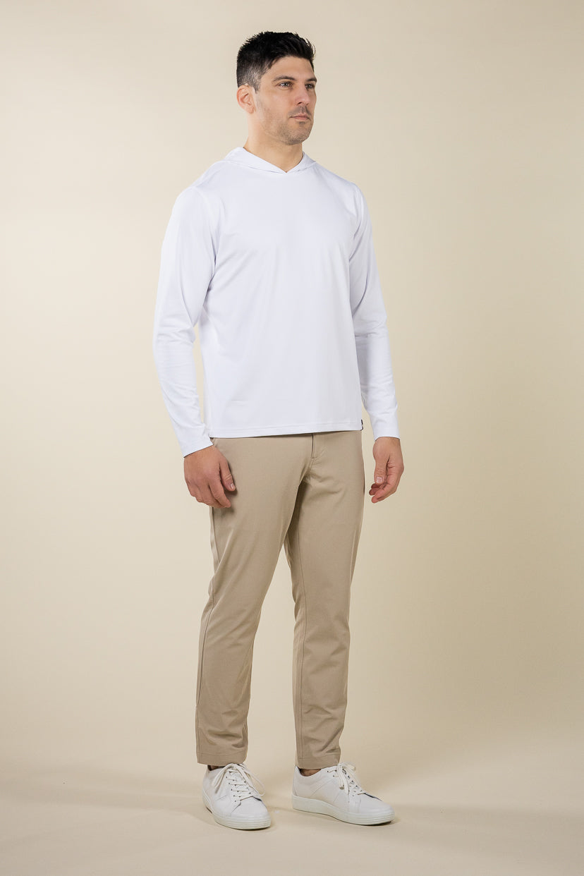 A modern performance hoodie designed with a clean, understated look. The Belmont Hoodie delivers lightweight warmth, stretch, and breathability, making it an easy layer for travel, warm-ups, or casual wear.