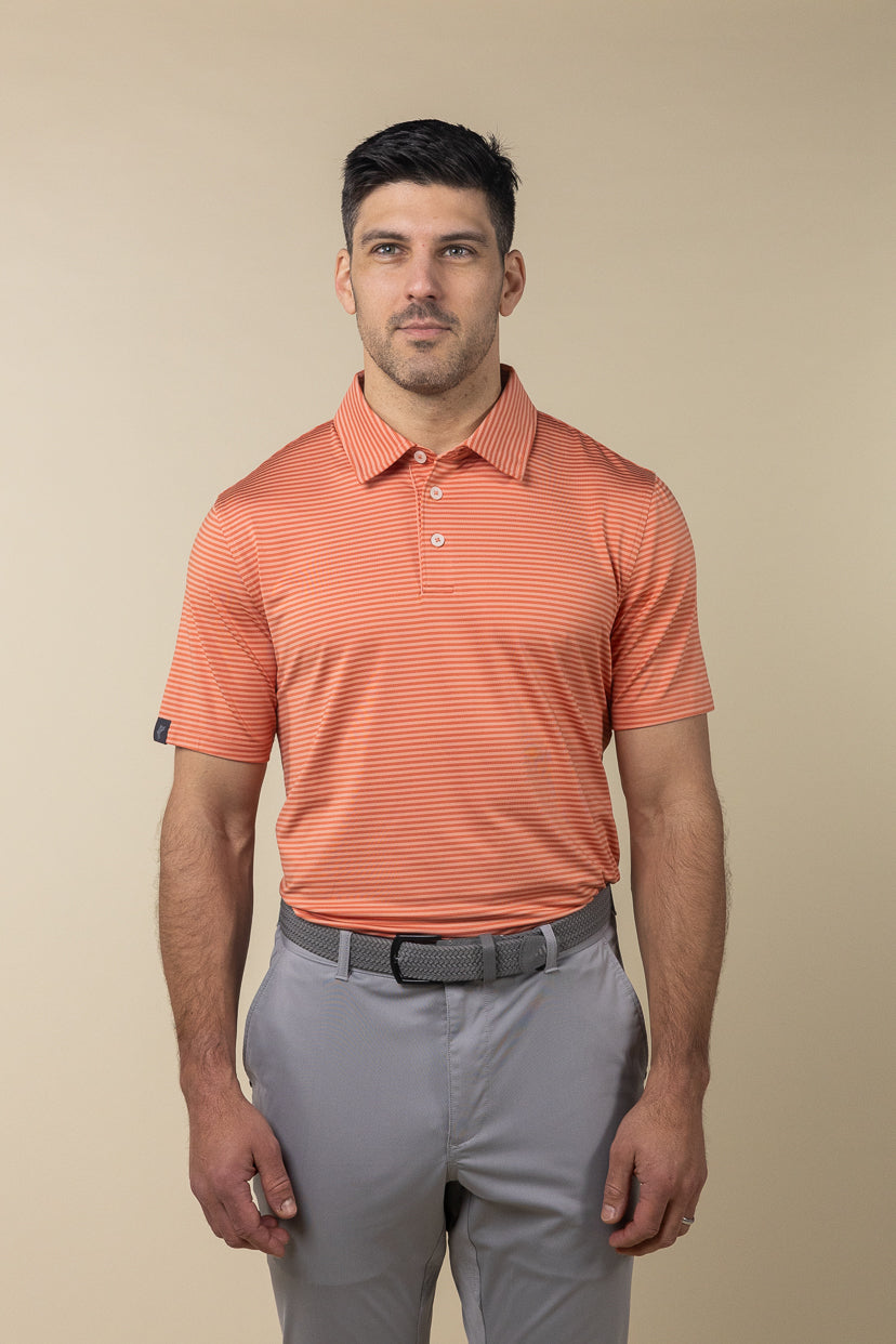 The Fairway polo combines semi-dull poly yarn with spandex to achieve a classic, crisp stripe appearance. Enhanced with a special yarn process, it boasts a super soft hand feel and stretch comfort, catering perfectly to golfers seeking enduring quality and comfort on the course.